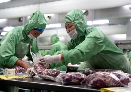 內(nèi)蒙古錫林郭勒大莊園肉業(yè)有限公司的員工在包裝羊肉。記者任軍川/攝